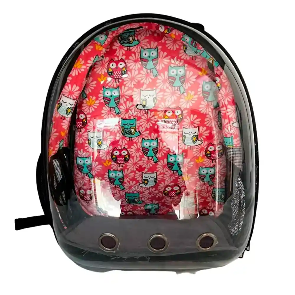 Características: - Su diseño ligero y resistente permite cargar y llevar a tu mascota a todas tus aventuras, como viajar, caminar, pasear, hacer senderismo o simplemente trasladarla a las visitas del veterinario. - Tiene una máscara transparente de PVC, para que tu mascota pueda tener una amplia vista. - Ideal para gatos de tamaño pequeño a mediano y perros cachorros o de raza pequeña como chihuahuas, pug, shi tzu, maltes, piquines o mini toy. (Hasta 6 Kg) - Tiene excelente ventilación, gracias a 9 grandes agujeros en ambos lados y frontal, además de las redes de ventilación izquierda y derecha que garantizan la circulación de aire fresco. - Su bolsillo lateral puede ser utilizado para guardar alimentos o snacks. Diseño: Buhos Multicolores, en fondo rosado.