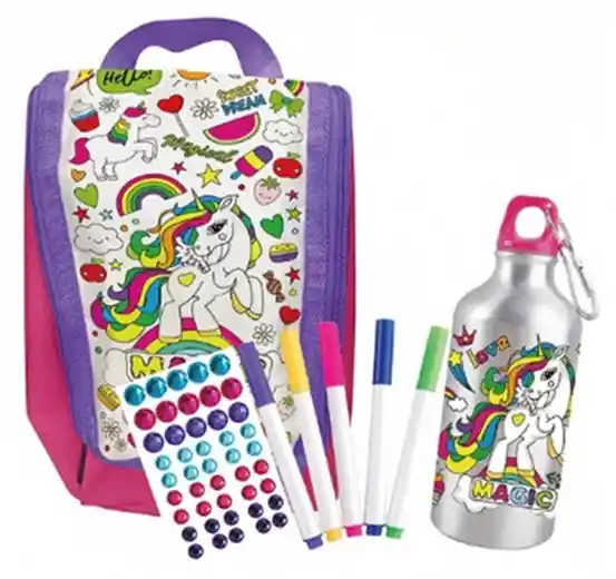 Lonchera y Botella de Agua Creativa para Niños: ¡Dale Vida con Colores! Perfeto regalo de cumpleaños, navidad o cualquier otra ocasión. ¡Presentamos nuestra Lonchera con botella de agua especial para niños, diseñada para despertar su creatividad y hacer que la hidratación sea aún más divertida! Con esta Lonchera podrán transportar todo lo que necesiten para el colegio o cualquier otra actividad. Este pack es más que una lonchera común o recipiente para líquidos, los niños tendrán la pintarlos y decorarlos a su manera. Características Principales: 1. Material Seguro y Duradero: Fabricada con materiales de alta calidad y seguros para los niños, esta botella de agua es resistente y está libre de BPA, garantizando la salud de tus pequeños mientras disfrutan de su obra maestra. 2. Superficie Listo-para-Pintar: La Lonchera y la Botella vienen con una superficie especial que actúa como un lienzo para que los niños dejen volar su imaginación. La pintura de los lápices que vienen incorporados se adhiere fácilmente y se seca rápidamente, permitiendo que los pequeños artistas creen diseños coloridos y únicos. 3. Incluye lápices y gemas: Cada pack viene con un conjunto de lapices no tóxicas y con una serie de gemas, todo lo que necesitan para comenzar a pintar y decorar de inmediato. Los colores vibrantes y la facilidad de aplicación garantizan una experiencia creativa y sin complicaciones. 3. Tapón Hermético Anti Derrames: La botella cuenta con un tapón hermético que evita derrames accidentales, ideal para llevarla al colegio, para hacer deporte, al parque o a cualquier aventura. 4. Capacidad Perfecta para Niños: Con una capacidad adecuada para las necesidades de los niños, esta botella es fácil de sostener y beber, promoviendo hábitos saludables de hidratación y la lonchera tiene el tamaño perfecto para llevar lo que necesites al colegio, vacaciones o algún paseo