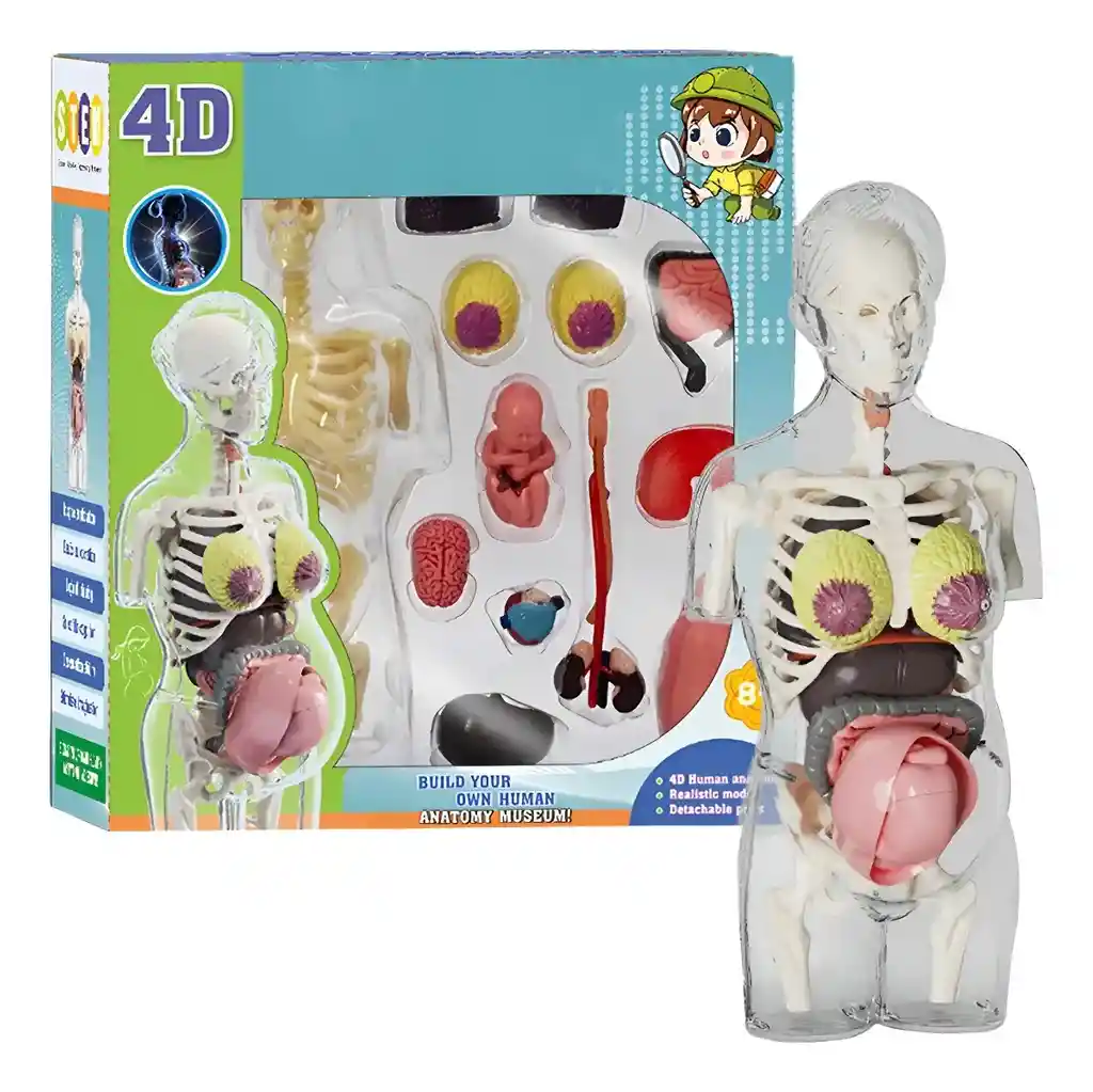 Modelo Anatomía Humana 4D – Cuerpo Humano Desarmable Educativo ¡Aprender anatomía nunca fue tan entretenido! Este increíble Modelo 4D del Cuerpo Humano permite a niños y niñas descubrir cómo funciona el cuerpo por dentro, de manera didáctica, visual y práctica. Ideal para estimular la curiosidad científica, el aprendizaje escolar y el desarrollo cognitivo