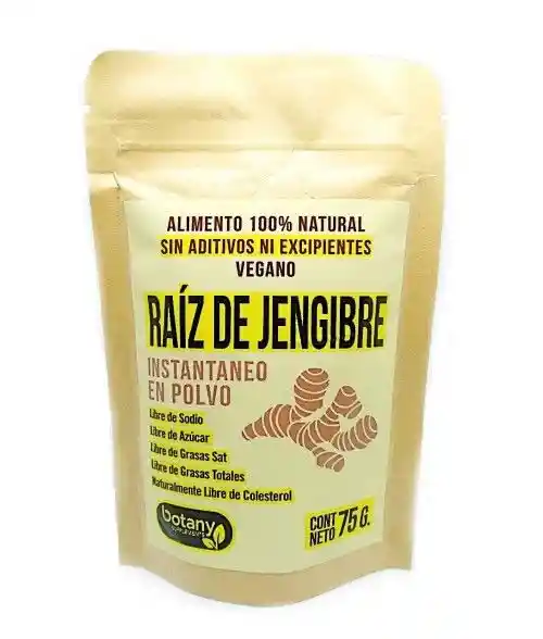 PRESENTACIÓN: 75 g BENEFICIO DEL PRODUCTO: Alimento 100% natural, sin aditivos ni excipientes. Naturalmente libre de colesterol. MODO DE USO: En batidos, cereal, reposteria, platos salados, infusiones. ALMACENAMIENTO: Mantener en lugar fresco y seco a no mas de 25 grados. Una vez abierto debe quedar bien sellado. PRECAUCIONES: Mantener fuera del alcance de los niños. INGREDIENTES: Polvo de raíz de jengibre