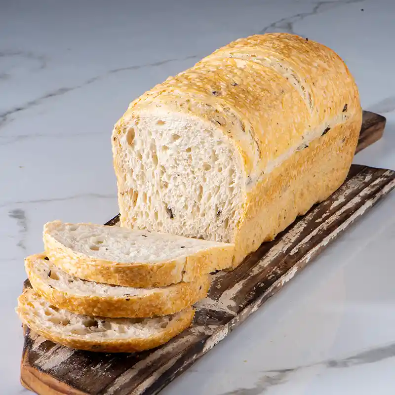 Pan de molde rústico blanco de masa madre y harinas puras sin aditivo, con aceitunas negras y aceite de oliva extravirgen. 800 gr.
