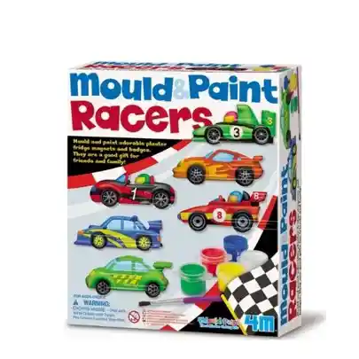 Es un juego de manualidades donde podrán hacer sus propios imanes o prendedores de autos de carrera, utilizando los moldes, el yeso y las pinturas que se incluyen en el kit.
