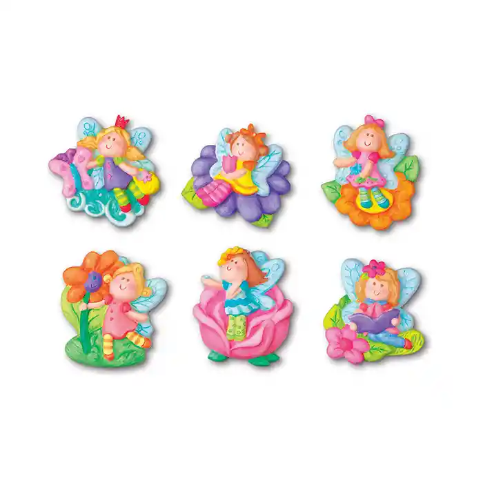 Son unas preciosas hadas que podrás hacer, es un juego que a la vez son manualidades para hacer sus propios imanes o prendedores de hadas que brillan, utilizando los moldes, el yeso y las pinturas que se incluyen en el kit.