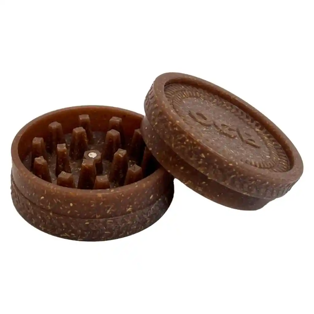 Moledor de 55 mm fabricado con material derivado del cáñamo compostable. Diseño ligero y funcional con cierre magnético que mantiene el contenido seguro. Altura aproximada de 25 mm, práctico para uso diario y fácil transporte. Opción ecológica y resistente.
