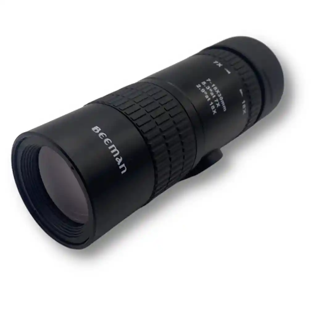 MONOCULAR BEEMAN 7-18×30 K1040 Monocular Telescope Marca Beeman Modelo KL1040 Aumento 7 a 18 veces Diámetro del objetivo 30 milímetros Doble ajuste fino Tapas de goma para los dos lentes Material recina y metal Color negro Peso del monocular 150 grs (con funda 180) Largo extendido 17 cms (guardado 13 cms) Diametro 4,5 cms Encaje para un tripode Separador de contraluz o pestañas Incluye funda Funda para fijar al cinturon o a la muñeca Presentacion en caja serigrafiada