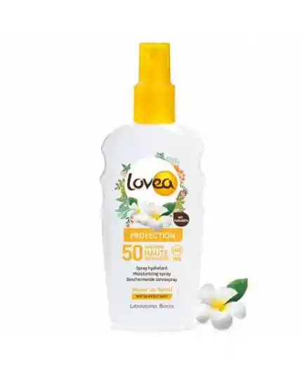 Lovea ofrece su Protector Solar Hidratante Spray SPF50 Monoi de Tahiti. Formulado sin parabeno, protege eficazmente los rayos UVA y UVB. Gracias al sistema Spray, las cremas de protección solar Lovea se aplican de una sola vez. La sobreexposición al sol es una seria amenaza para la salud. Waterproof. Todos los bloqueadores lovea tienen sobre el 95% de sus ingredientes orgánicos, son fórmulas veganas, fabricados y envasados en Francia.