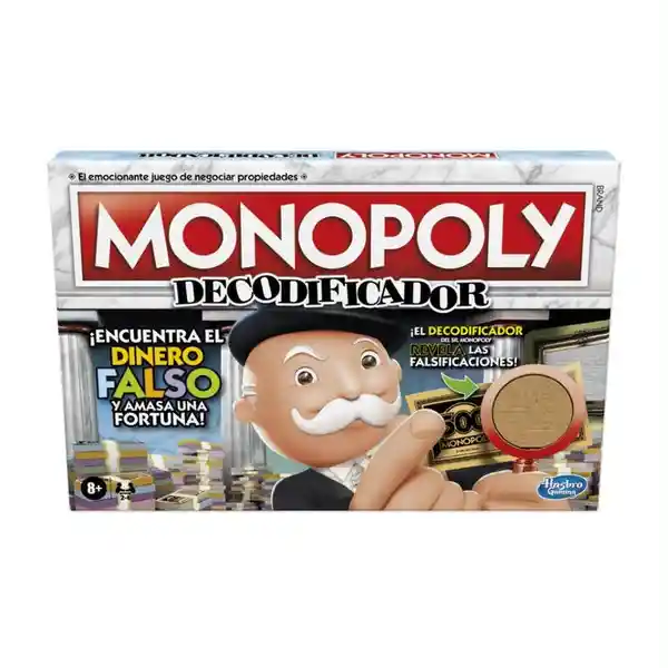 En el Juego Monopoly Decodificador Las Cosas no Siempre Son lo Que Parecen. ¡Alguien Agregó Dinero Falso y Tarjetas de Chance Falsas! Afortunadamente en Esta Nueva Edición el Sr. Monopoly Les Está Dando a Los Jugadores su Decodificador Para Que Puedan Encontrar Las Falsificaciones y Aún Así Hacer Una Fortuna. Es un Emocionante Juego de Revelaciones Ocultas en Donde Los Jugadores Pueden Desafiar a Sus Oponentes Por Usar Falsificaciones Con Monedas de Acusación. Pero Deberán Utilizarlos Sabiamente ya Que Solo Obtienes Unas Pocas Monedas Para Jugar. Incluye Fichas de Monopoly Que Reproducen el Tema Engañoso. El Jugador Con Más Dinero al Final ya Sea Real o Falso Gana. Este Juego de Mesa Familiar es Una Gran Opción Para la Noche de Juegos Ideal Para Pasar Interminables Horas de Mucha Diversión. Incluye un Tablero de Juego Decodificador de Plástico 6 Fichas 22 Cartas de Título de Propiedad 24 Cartas de Oportunidad 14 Cartas de Cofre Comunitario 12 Fichas Decodificadoras de Cartón 12 Hoteles 2 Dados Paquete de Dinero y Guía Del Juego.
