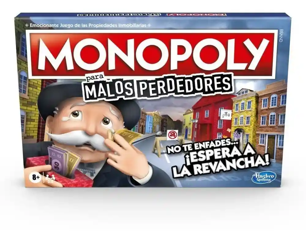 No te pongas triste... ¡espera a la revancha! Dile adiós a la frustración de perder una partida de Monopoly, y dale la bienvenida al juego Monopoly para malos perdedores. En este cómico giro del juego de mesa Monopoly, vale la pena perder. Te ocurrirán todas esas cosas frustrantes que normalmente pasan en una partida como tener que pagar rentas, ir a la cárcel o estar a punto de ir en bancarrota. El jugador que comienza a hundirse puede regresar a la partida con el token de Sr. Monopoly, el cual brinda ventajas sobre los demás jugadores. ¡Así que juega, consigue la venganza que has estado esperando, y siéntete bien por haber estado perdiendo! Puede que las noches de juego en familia nunca vuelvan a ser las mismas con este juego. Edad: 8 años en adelante. Los nombres y logotipos de Hasbro, Hasbro Gaming, Parker Brothers y Monopoly, el diseño distintivo del tablero, los cuatro cuadrados de esquinas, el nombre y personaje Mr. Monopoly, así como cada uno de los elementos distintivos del tablero y las piezas de juego son marcas de comercio de Hasbro para su juego de negociación de propiedades y sus accesorios.