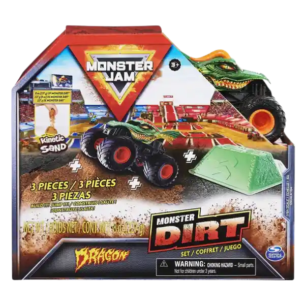 Prepárate para la acción monstruosa con el Playset de Monster Dirt! Moldea la arena kinética para construir y saltar rampas con el camión incluido o cualquiera de tus Monster Jam (se venden por separado). Conviértete en el mejor campeón con detalles auténticos y neumáticos manchados de suciedad en el camión Die Cast a escala 1:64 de El Dragone, incluido en este set. Colecciónalos todos y organiza tu propio evento Monster Jam. Se recomienda de 3 años en adelante.