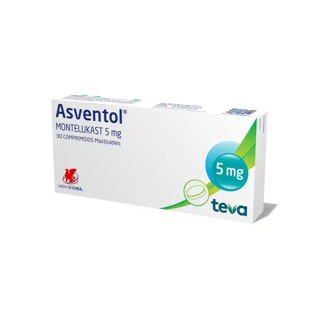Principio activo: Montelukast Sódico (5 mg). Caja con 30 comprimidos masticables, está indicado en la profilaxis y tratamiento del asma crónica en adultos y niños mayores de 5 años, leer indicaciones y contraindicaciones, si los síntomas persisten, consulte a su médico.