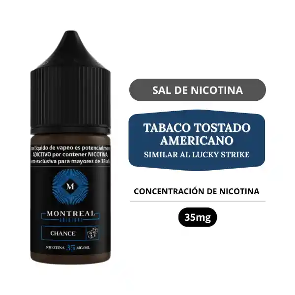 Montreal Original Chance SALT 30 ml (35 mg): tabaco tostado americano con cuerpo limpio y seco, sin dulzores añadidos. Perfil clásico al estilo Lucky Strike. Base 50/50 ideal para pods MTL.