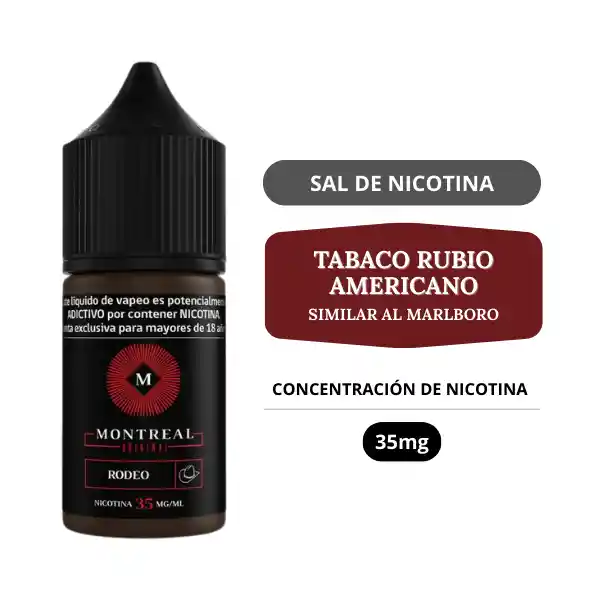 Montreal Original Rodeo SALT 30 ml: tabaco rubio americano con dulzor natural y ligera sequedad, un perfil clásico que se asemeja al estilo Marlboro. Base 50/50 en sales de nicotina (35 mg), ideal para pods MTL.