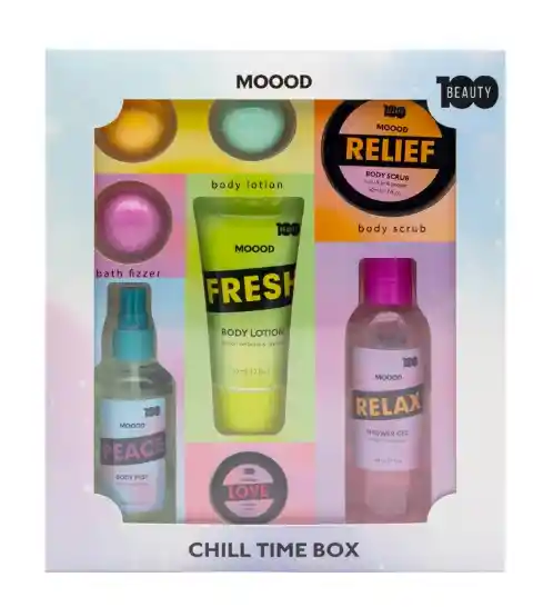 CHILL TIME BOX BOMBAS DE BAÑO, CREMA CORPORAL. GEL DE DUCHA, BODY MIST Y EXFOLIANTE