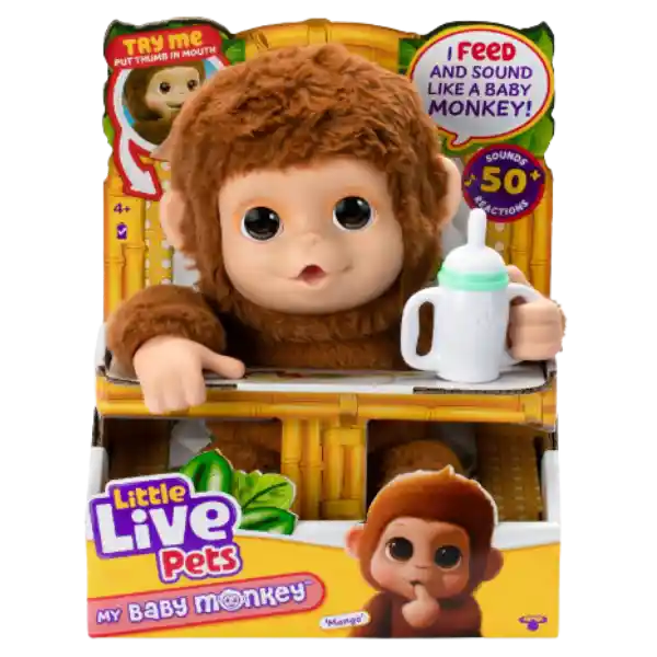 Little Live Pets My Baby Monkey es el animal bebé más lindo y divertido que cualquiera podría tener. Mango the Baby Monkey está esperando que alguien cuide y juegue con él. El mango se ve como un mono real con adorables orejas de mono y piel suave, a los niños les encantará sostener y abrazar Mango. Esta pequeña mascota viva actúa y reacciona como un mono bebé real, incluyendo más de 50 sonidos y reacciones mientras tu hijo interactúa con este lindo mono bebé. Mango tiene una boca expresiva que se mueve mientras se chupa el pulgar y se alimenta con una botella. A mango le encanta que lo cuiden y cuiden, y reaccionará a su tacto y cuidado, ¡incluso puede hacerle cosquillas y se reirá! Cuando Mango está cansado de toda la diversión, es hora de que Mango duerma. Escucha a este pequeño mono soñoliento tararear una canción de cuna poniéndolo boca arriba. ¡A mango también le encanta dormir mientras cuelgan boca abajo! My Baby Monkey tiene manos de agarre de mono que le permiten agarrar y aferrarse a cosas como un mono real. Los niños también pueden firmar el certificado de adopción de Mango y hacer la promesa de cuidarlo siempre. ¡En poco tiempo, Mango se convertirá en su mejor mejor amiga! Mide proximadamente 33 cm de alto. Se recomienda de 4 años en adelante.
