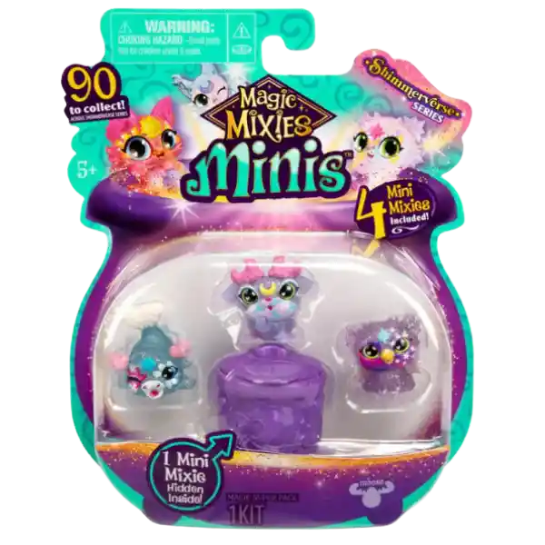 ¡Bienvenidos al Shimmerverse! ¡Ahora tu hijo puede entrar en un nuevo reino mágico donde los Mixies esparcen su magia por todo el mundo dejando un poco de brillo dondequiera que vayan! ¡Los Magic Mixies Minis son pequeños en tamaño pero grandes en sorpresa! ¡Los Minis traviesos y mágicos son muy divertidos con todas sus diferentes formas de jugar! Hay 90 Magic Mixies Minis para que los niños coleccionen en cinco nuevos poderes mágicos: Starlight, Ice, Sun, Rainbow y Moonstone. ¡Cada poder tiene una revelación mágica diferente, como brillo, revelación de brillo y cambio de color! ¡Quizás encuentres una Heira iluminada de edición limitada! El paquete de cuatro Magic Mixies Minis contiene cuatro figuras de juguete Minis, incluido un Mini Mixie escondido dentro de un caldero. ¡Colecciona los 90 Magic Mixies Minis ( cada uno se vende por separado) y únete a ellos mientras viajan a través del Shimmerverse y se aventuran en un nuevo mundo de magia real! Se recomienda de 5 años en adelante.