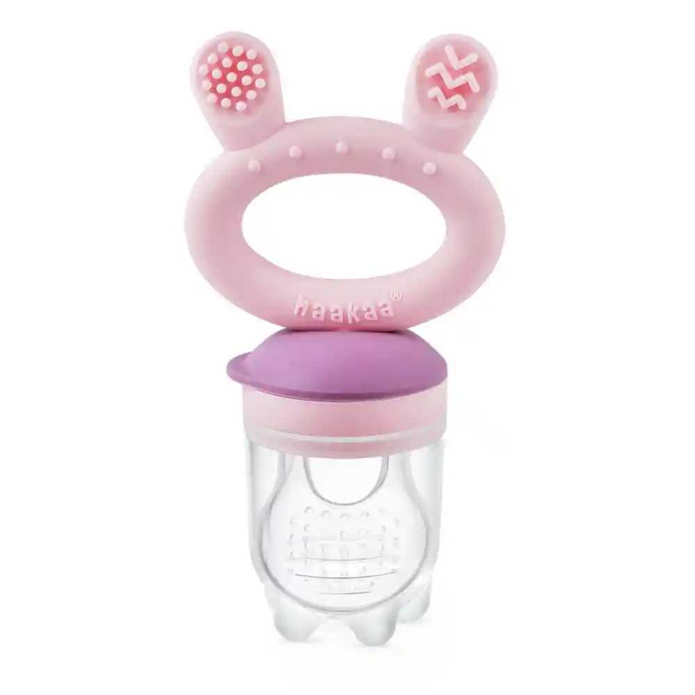 ¡El mordedor de silicona para alimentos frescos Haakaa es la manera perfecta de introducir sólidos a la dieta de tu bebé sin riesgos! Simplemente coloca frutas, verduras o carne en la bolsa de silicona y séllala bien. Incluso lo puedes usar para hacer helados con leche materna congelada. Características: Bolsillo de silicona suave con pequeños orificios para facilitar la alimentación que solo permiten el paso de trozos pequeños y digeribles. El diseño 100% de silicona hace que el comedero sea seguro para que tu hijo mastique y succione. Las crestas y las cerdas de las orejas del conejo masajean los dientes y las encías de tu hijo. Colores divertidos y brillantes para estimular el desarrollo sensorial del bebé. Alienta a tu hijo a alimentarse por sí mismo, desarrolla su independencia, desarrolla confianza y mejora la coordinación ojo-mano. El mango fácil de sujetar ayuda a desarrollar la motricidad fina y también se puede usar como mordedor gracias a su material y textura. Asegure la tapa para evitar asfixia. Apto para lavavajillas, fácil de usar y limpiar. No genera bacterias, a diferencia de las alternativas de malla. Sin BPA, PVC ni ftalatos. Apto para 4 meses en adelante. Esterilizador de microondas seguro. NOTA: Este producto está diseñado para ser más difícil de abrir que otros productos para evitar se escape la comida y asi evitar riesgos de asfixia.