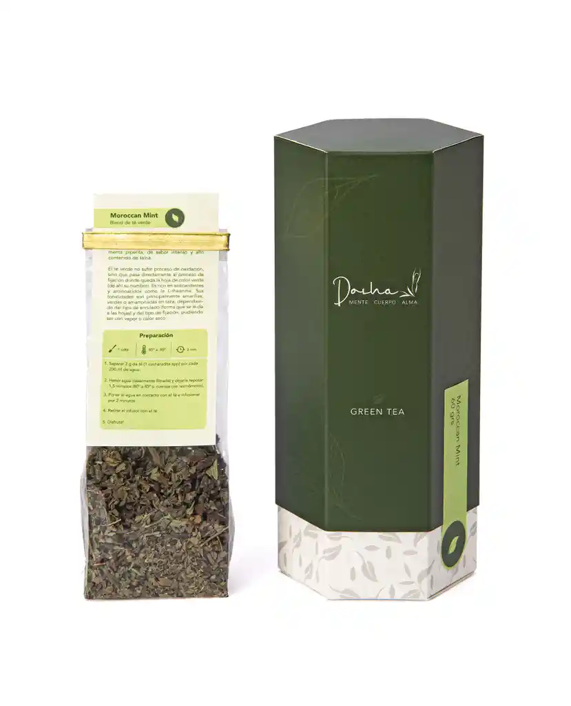 Té Verde con Menta Sumérgete en la frescura de un blend revitalizante que combina el té verde Gunpowder con la refrescante menta piperita. Con un sabor intenso y de base robusta y ahumada, mientras que la menta piperita agrega una nota refrescante y vivaz que equilibra perfectamente la mezcla. Beneficios para la Salud del Té Verde con Menta: ✓ Activa y Refuerza el Sistema Cardiovascular y las Defensas: Sus antioxidantes y nutrientes activan y fortalecen el sistema cardiovascular y las defensas del cuerpo, proporcionando una mayor resistencia contra enfermedades y promoviendo una salud óptima. ✓ Reduce Degeneración Muscular: Contribuye a reducir la degeneración muscular y promueve la salud muscular, ofreciendo apoyo para mantener la fuerza y la vitalidad física a lo largo del tiempo. ✓ Estimula la Memoria y Mantiene las Células Activas: Sus componentes estimulan la memoria y mantienen las células activas, promoviendo una función cognitiva saludable y una mente alerta. ✓ Ayuda a Combatir Dolores de Cabeza: La menta piperita tiene propiedades analgésicas y refrescantes que pueden ayudar a aliviar los dolores de cabeza y las molestias asociadas, proporcionando un alivio natural y refrescante. Maridaje: Marida bien con pollo a la parrilla, salmón al horno, ensalada de quinoa, y tofu marinado. Acompañamientos como arroz integral, vegetales al vapor, ensalada de tomate y pepino, y hummus con zanahorias, y postres como tarta de limón, sorbete de lima, yogur con miel, y frutas frescas complementan su sabor. Momento de Consumo: Moroccan Mint es ideal para disfrutar por la tarde o después de una comida. Su sabor refrescante y ligeramente astringente lo hace perfecto para acompañar comidas ligeras y saludables, así como para una pausa refrescante y digestiva en cualquier momento del día.