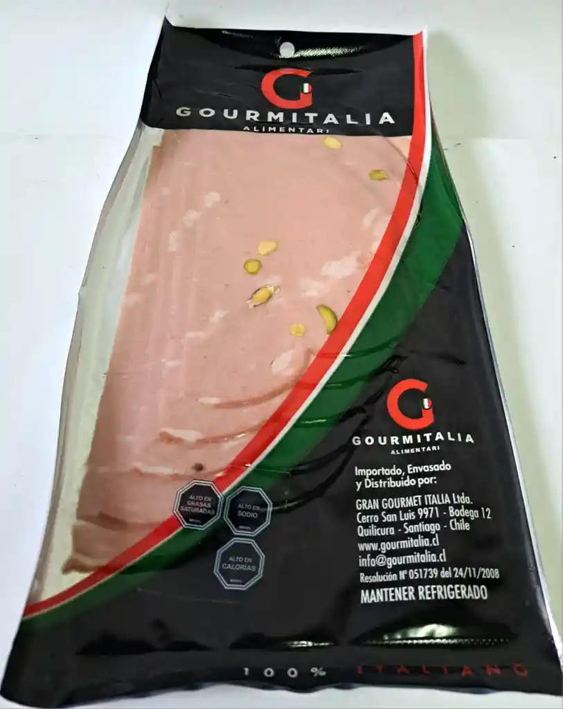 Mortadella Bologna es una salchicha cocinada hecha exclusivamente con carne de cerdo pura, de color rosa y con un aroma intenso y ligeramente picante de algunas áreas de Emilia Romagna y Lombardía. 100g