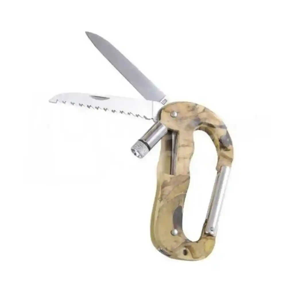 Características principales Marca Resilent Modelo Mosqueton 5 en 1 supervivencia Otras características Largo: 88 " Material del mosquetón: plastico Sistema de cierre: Automático DESCRIPCIÓN: Clip de mosquetón multiherramienta con linterna LED, cuchillo plegable para acampada al aire libre, herramientas de supervivencia EDC, equipo de mochilero