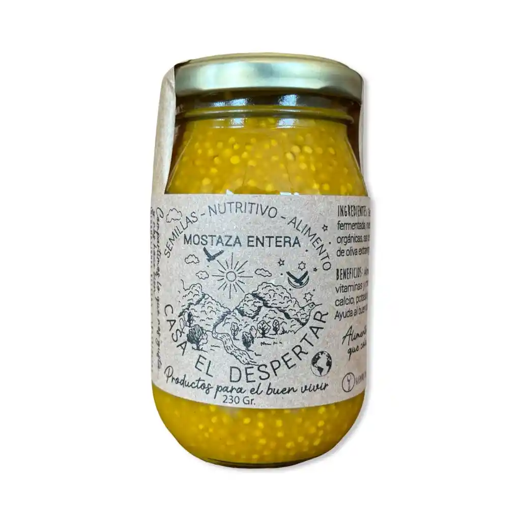 Alimento saludable y natural, contiene semillas de mostaza organica fermentada, miel natural, vinagre de manzanas organicas, sal de mar, curcuma en polvo y aceite de oliva extra virgen.