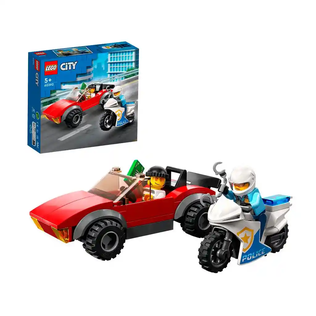 ¡Moviliza la imaginación de tu peque con este juguete lleno de acción! El set LEGO® City Moto de Policía y Auto a la Fuga (60392) contiene una moto de persecución policial de juguete y un deportivo en el que un ladrón piensa huir. Incorpora al juego las minifiguras del agente de policía y el atracador, un billete de juguete y algo de imaginación para pasarlo genial atrapando ladrones durante horas. Guía de construcción digital interactiva para disfrutar más Este set 5+ viene con una guía de construcción paso a paso en formato impreso y con la app LEGO Builder: una guía interactiva con la que construir será aún más divertido, equipada con herramientas de acercamiento y giro que permiten a los niños visualizar los modelos desde todos los ángulos mientras conectan sus piezas. Juguetes que activan el juego imaginativo Los sets LEGO City llevan a los peques al centro de la acción y les animan a inventar historias con detallados edificios, asombrosos vehículos e inspiradores personajes. Juguete de persecución policial: El set LEGO® City Moto de Policía y Auto a la Fuga (60392) reserva a los niños a partir de 5 años montones de horas de divertidas aventuras atrapando ladrones. ¿Qué contiene la caja? Incluye todo lo que los peques necesitan para construir una moto de persecución policial y un deportivo en el que un ladrón piensa huir, además de minifiguras de un motorista de la Policía y un ladrón. Características y funciones: Los niños pueden enganchar las esposas de juguete para minifiguras en la moto de policía. Un divertido regalo de cumpleaños o solo porque sí: Este set LEGO® City Policía está diseñado para peques a partir de 5 años que disfrutan con los juguetes originales y adoran imaginar historias y jugar a interpretarlas. Dimensiones: El deportivo de juguete mide aproximadamente 4 cm de altura, 10 cm de longitud y 5 cm de anchura. Simpáticos accesorios LEGO®: Cuenta con unas esposas y un billete de juguete. Instrucciones de construcción impresas y digitales: Con la app LEGO® Builder, disponible para smartphones y tabletas, los niños pueden acercar, girar y visualizar los modelos terminados mientras los construyen. Modelos diseñados para explorar el mundo jugando: Los sets LEGO® City favorecen el desarrollo de las habilidades físicas y refuerzan la confianza mediante el juego creativo. Garantía de calidad: Todos los componentes LEGO® cumplen estrictas normas del sector, por lo que ofrecen siempre las mismas cualidades, son compatibles entre sí y proporcionan una divertida experiencia de construcción; así ha sido desde 1958. La seguridad es lo primero: Los elementos y ladrillos LEGO® se dejan caer, se calientan, se aplastan, se retuercen y se analizan para verificar que satisfacen rigurosos estándares mundiales de seguridad.