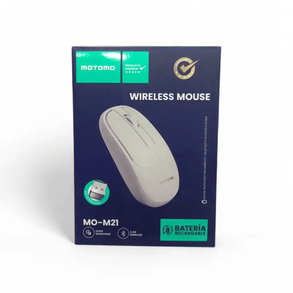 Mouse inalámbrico recargable MOTOMO M21 con diseño compacto, conexión estable y batería recargable para uso prolongado.