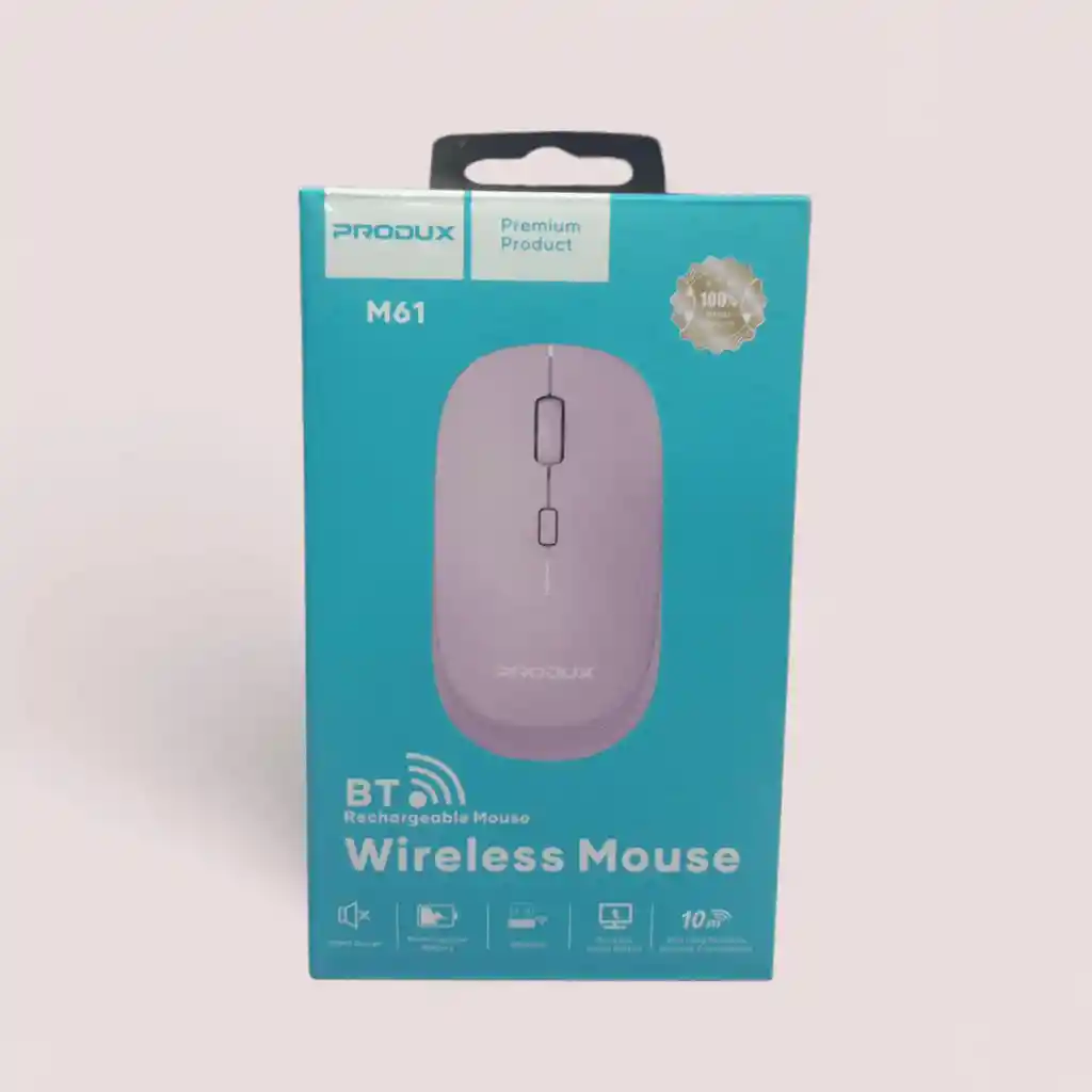 Mouse inalámbrico Produx M61 con conexión Bluetooth estable, batería recargable y diseño ergonómico. Ideal para estudio, oficina y uso diario. Alcance de hasta 10 metros y clic silencioso que mejora la experiencia de trabajo.