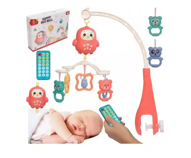 MÓVIL GIRATORIO CUNA BEBE CON LUZ Y MÚSICA CUNA HAPPY BED BELL -Con mando a distancia, rotación y música -Ajuste de volumen arriba/abajo, caja de música móvil electrónica. -Con 5 divertidos juguetes mordedores, se pueden separar, material: plástico seguro, lindos juguetes de dibujos animados giran lentamente, puede atraer la atención del bebé, ayuda a ejercitar la vista del bebé.