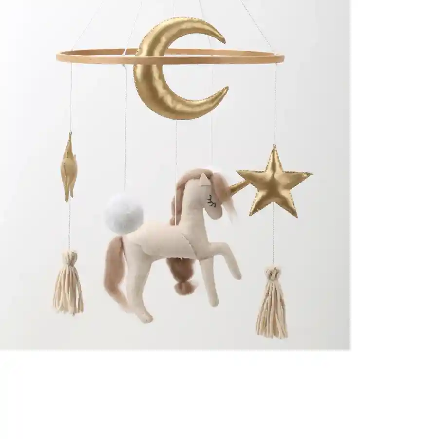 Este móvil de madera y tela es perfecto para la cuna de tu bebé. Con un diseño seguro y resistente, brinda una estimulación visual para el desarrollo sensorial de tu bebé. Disfruta de la tranquilidad y comodidad de ver a tu bebé entretenido con este móvil de cuna. Producto no viene con soporte de madera.