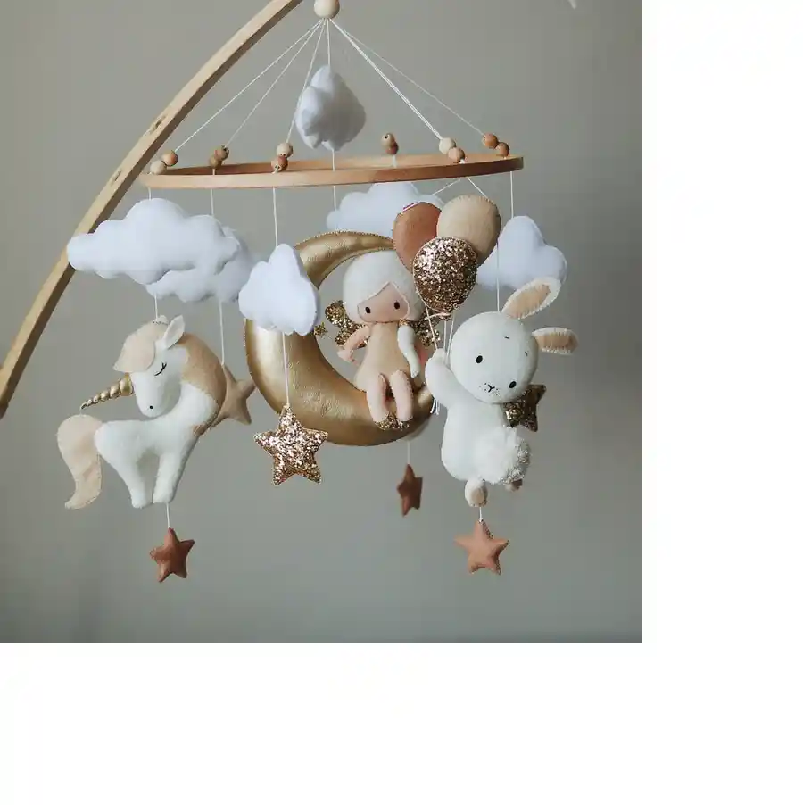 Este móvil de madera y tela es perfecto para la cuna de tu bebé. Con un diseño seguro y resistente, brinda una estimulación visual para el desarrollo sensorial de tu bebé. Disfruta de la tranquilidad y comodidad de ver a tu bebé entretenido con este móvil de cuna. Producto no viene con soporte de madera.