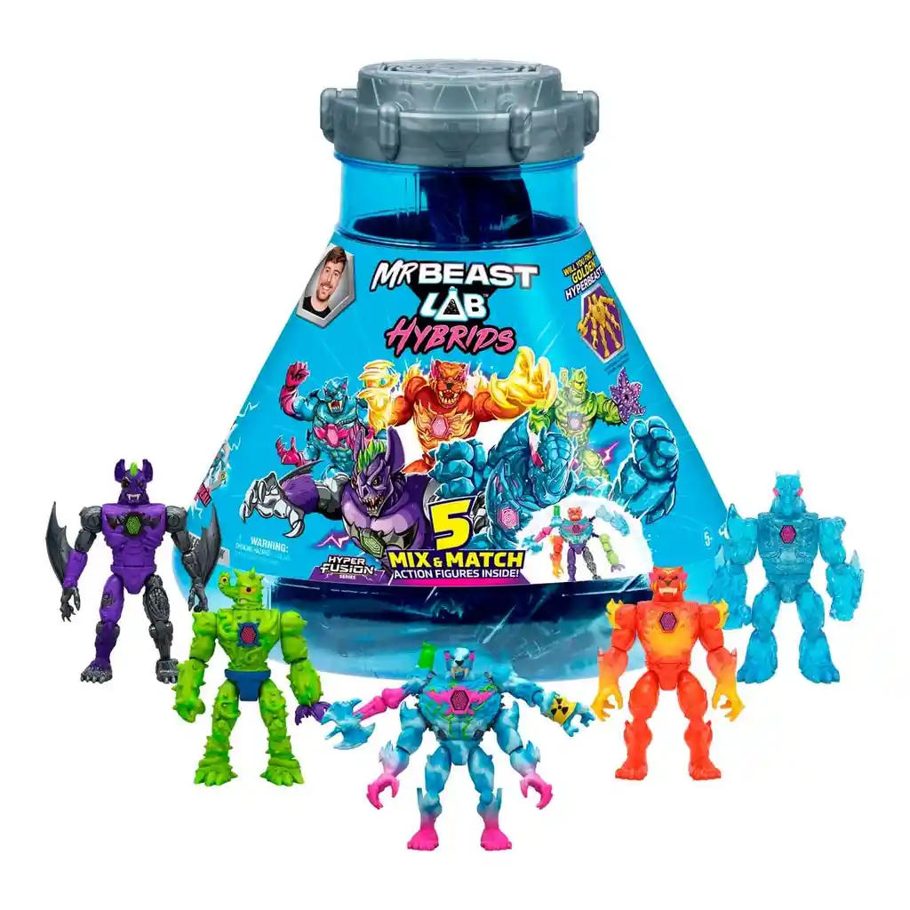 Con MrBeast Lab Hybrids, el poder de la fusión está en sus manos: ¡mezclando y combinando millones de combinaciones para construir la figura de acción definitiva de MrBeast! ¡Experimenta a lo grande con el Mega Pack para mezclar y combinar 5 híbridos! El experimento comienza con el recipiente de MrBeast Lab: gire y abra la tapa para revelar una tira masiva de 13 bolsas de aluminio selladas. Ábrelos para descubrir partes individuales de bestias para crear cinco figuras de acción épicas de 4 pulgadas (10,16 cm) de altura, incluida la Mega Pantera Torso. Coloca la figura del Super Híbrido en el recipiente y agrega agua. Vierte, gira y revela el verdadero color de tu Hybrid. ¿Encontrarás una Hiperbestia Dorada? 30+ Bestias para coleccionar.