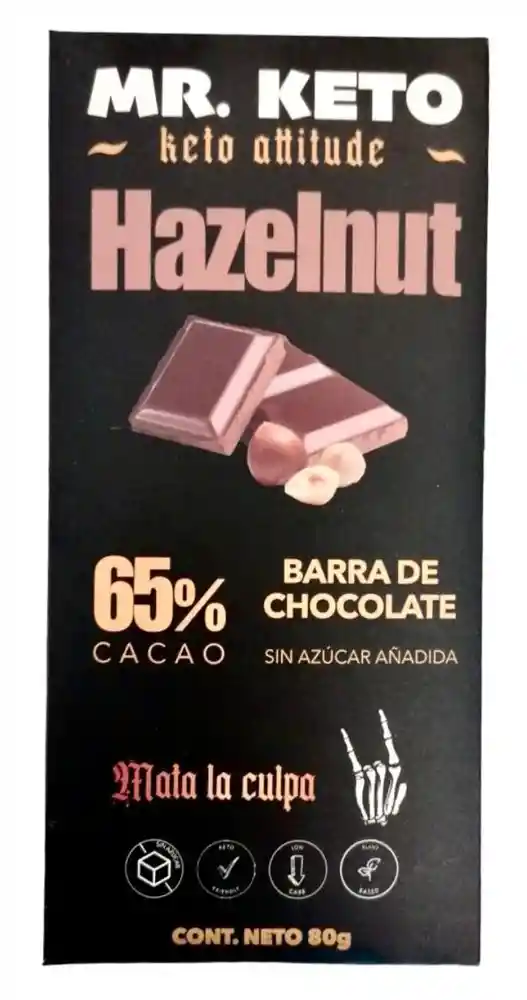 Barra de chocolate con 🍫 65% Cacao, 0 azúcar y trocitos de avellana. Producto vegano