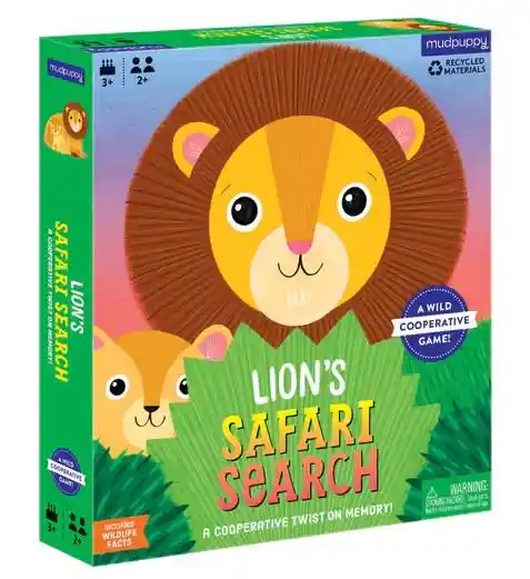 Lion's Safari Cooperative Game de Mudpuppy es un juego nuevo y divertido que crea una comunidad, fomenta el respeto y apoya el desarrollo socioemocional. Los jugadores trabajan juntos para voltear e intercambiar fichas, recordando lo que hay debajo, pero ten cuidado de no revelar la ficha del sol y la noche comenzará a caer. Encuentra todos los cachorros antes de que se ponga el sol y todos ganan. Incluye: 1 tablero de juego, 1 alfombrilla de león, 1 ficha de sol, 20 fichas con forma de hierba, datos divertidos e instrucciones. Todos los productos Mudpuppy se adhieren a las normas de seguridad CPSIA, ASTM y CE. El cartón gris contiene un 90 % de papel reciclado. Impreso con tintas no tóxicas a base de soya. Se recomienda de 3 años en adelante, para 2+ jugadores.
