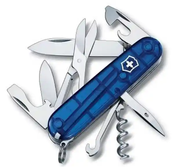 Descripción: ¿Una excursión de alpinismo o de trekking? Con la Climber llegará más lejos. Herramientas: hoja grande hoja pequeña sacacorchos abrelatas con destornillador pequeño destapador con destornillador desaislador pelacables punzón Anillo inoxidable pinzas palillo de dientes tijeras multi-purpose hook (parcel carrier) Características Técnicas Color: Azul Translúcido Longitud: 91 mm Anchura: 27 mm Profundidad: 18 mm