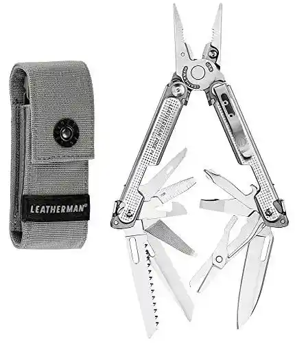 Herramientas 01 Alicates de punta fina 02 Alicates Regulares 03 Cortadores de alambre reemplazables 04 cortadores de alambre duro reemplazables de primera calidad 05 cuchillo 420HC 06 Cuchillo serrado 420HC 07 tijeras de acción de primavera 08 Sierra 09 herramienta de palanca 10 abridor de paquetes 11 Awl 12 Abrelatas 13 Pelacables 14 Regla (1.41 in | 25 mm) 15 lima de madera / metal 16 Abrebotellas 17 Arrugador eléctrico 18 Destornillador Phillips 19 Destornillador mediano 20 destornillador pequeño 21 Destornillador extra-pequeño