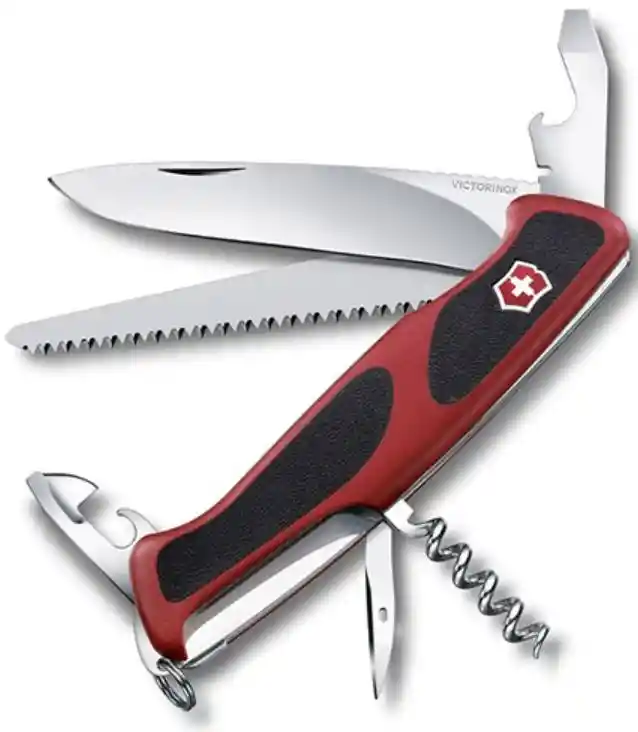 Navaja multiusos Victorinox Rangergrip 55 130 mm rojo negro, la todoterreno con mango ergonómico y antideslizante. Herramientas: Hoja grande bloqueable Abrelatas con Destornillador pequeño 3 mm Abrebotellas con Destornillador, bloqueable Desaislador pelacables Sierra para madera Punzón Sacacorchos Anillo inoxidable Pinzas Palillo de dientes