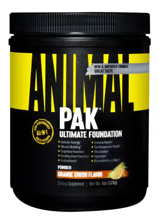 Multivitamínico "Animal Pak" de Universal Nutrition te proporciona una mezcla de minerales, vitaminas, importantes aminoácidos, y una multitud de los compuestos más avanzados para nutrir tus músculos. Cada pack contiene más de 30 ingredientes clave en sus cantidades adecuadas en el momento correcto. Cada servicio contiene una potente combinación de complejos minerales avanzados, vitaminas, aminoácidos, potenciadores del rendimiento, agentes lipotrópicos, enzimas digestivas y energéticos fabulosos para antes de entrenar. Todos estos nutrientes se combinan de forma equilibrada, dentro de una fórmula de emisión continua en polvo de fácil asimilación para el cuerpo. Debe ser considerado como el suplemento base de cualquier programa de nutrición. Si entrenas duro con pesas, entonces tienes la necesidad absoluta de formarte con Animal Pak.