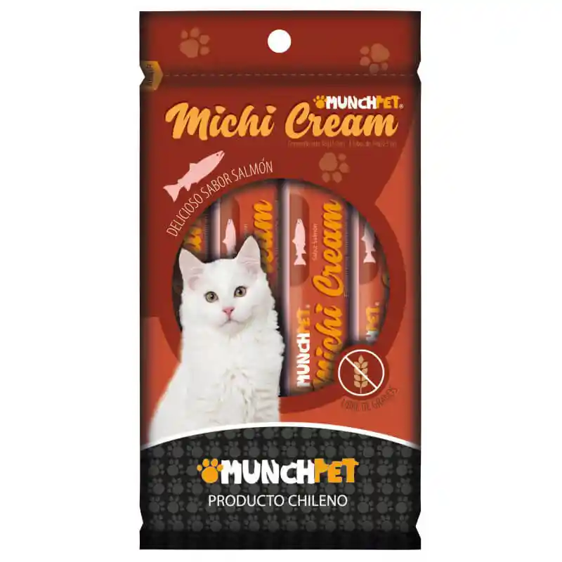 MunchPet Michi Cream Salmón delicioso snack cremoso sabor pollo camarón para gatitos de todas las edades. De apariencia cremosa que lo hace altamente palatable. Ideal para regalonear a tu mascota con este sano y novedoso producto.