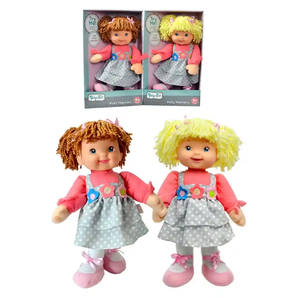 La primera muñeca Molly Manners del bebé. Viene con pelo de hilo rubio o moreno con coletas.Vestido con un moderno traje de lunares grises con acentos.Presiona su barriga, ella canta sobre modales y ser cortés. Baterías 2-AG13 incluidas."