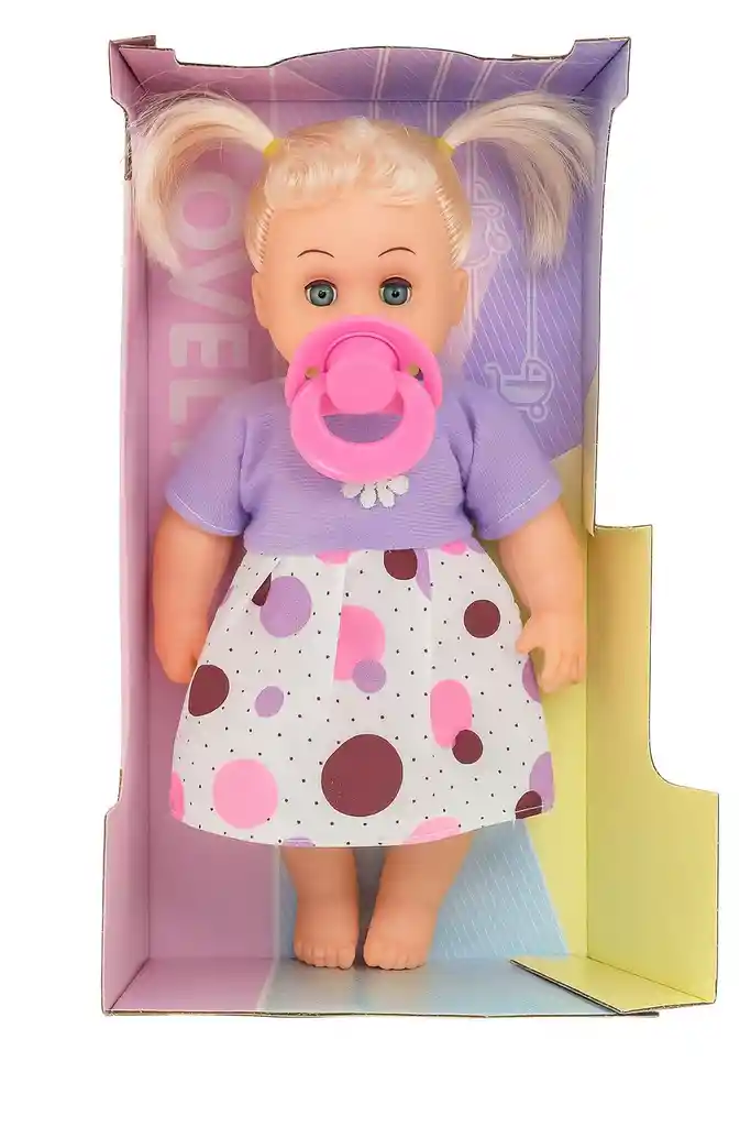 ¡Regala diversión y ternura! Esta preciosa muñeca bebé es el juguete perfecto para acompañar a las pequeñas en sus momentos de juego. Viene vestida con una blusa con flor bordada y una falda colorida con lindos lunares, que encantará a cualquier niña. Su cabello rubio con colitas y su chupete removible le dan un toque realista y adorable. Estimula la imaginación y el juego de roles Diseño colorido, atractivo y muy femenino Ideal para niñas desde los 3 años Incluye: • 1 Muñeca bebé (aprox. 26 cm) 1 Chupete Empaque listo para regalo ¡Ideal para cumpleaños, navidad o cualquier ocasión especial!