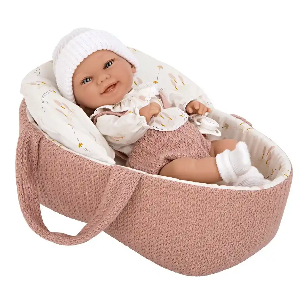 La muñeca Elegance Babyto Rosa de 33 cm Arias combina ternura y realismo, ofreciendo la sensación de sostener un bebé de verdad gracias a su peso equilibrado. Su piel de vinilo suave al tacto la hace aún más realista y delicada. Viste gorrito y conjunto en tonos rosa y blanco, y viene acompañada de un moisés a juego, creando un conjunto completo y adorable. Incluye chupete, convirtiéndola en una pieza ideal para coleccionistas de bebés reborn o como regalo especial.