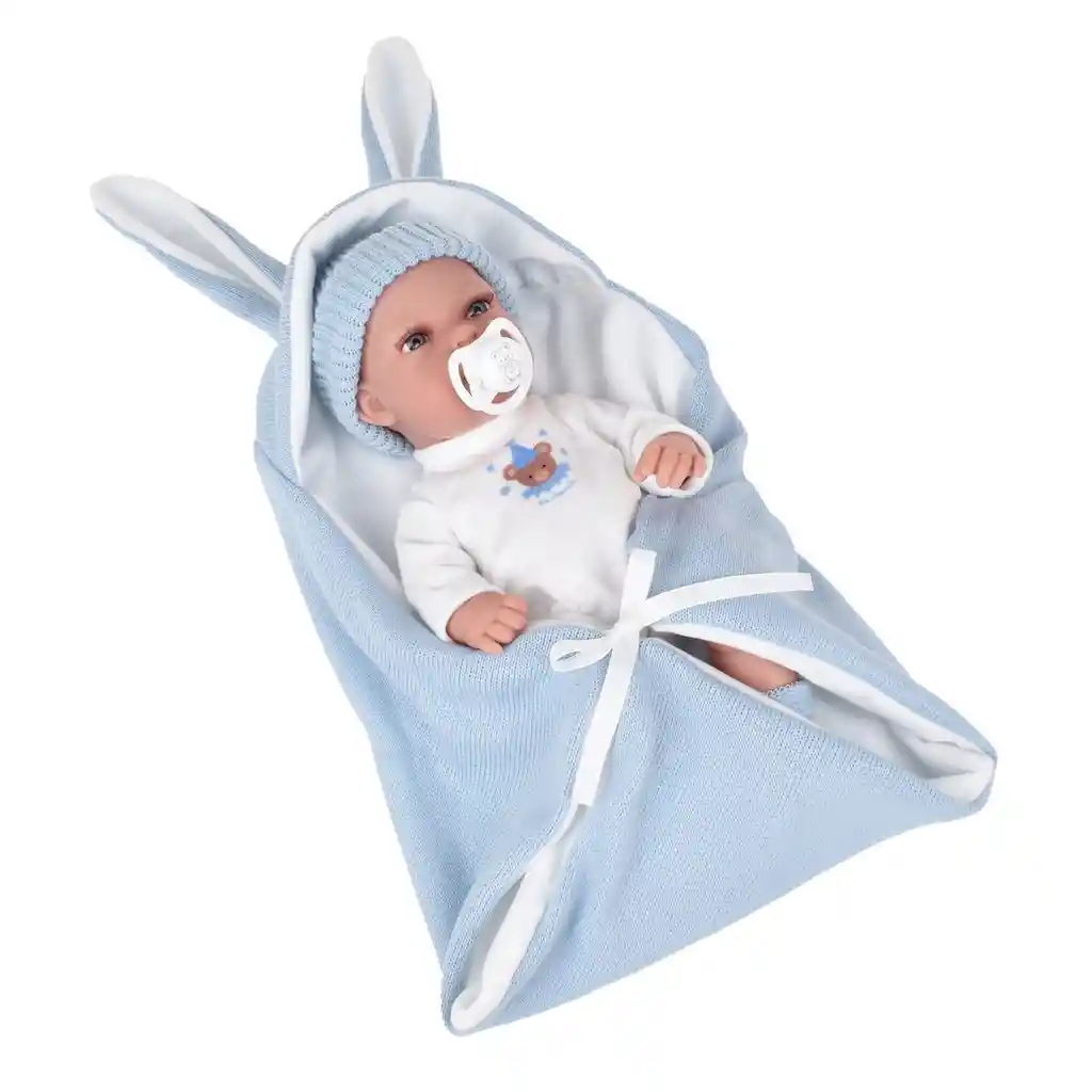La muñeca Elegance Natal Azul de 30 cm Arias combina ternura y realismo, ofreciendo la sensación de sostener un bebé de verdad gracias a su peso. Su piel de vinilo la hace suave al tacto, transmitiendo una calidez especial. Viste un body blanco con un delicado dibujo al centro, acompañado de gorrito y calcetines celestes que combinan con su saco de dormir. Incluye chupete y se presenta como un conjunto adorable y de alta calidad. Ideal como regalo especial o pieza de colección, este bebé reborn destaca por su acabado realista y dulzura.