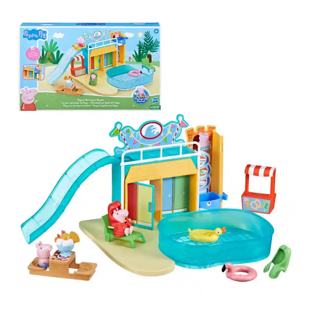 ¡Lánzate a la diversión con el set de juego Peppa en el parque acuático! Imagina un día en el parque acuático con tus personajes favoritos de Peppa Pig. Empieza por pasar por las puertas e ir de los vestuarios al lado de la piscina. Sube en el ascensor en forma de ballena hasta el segundo piso ¡y baja por el tobogán en un flotador en forma de flamencos! Date un chapuzón en la piscina y luego juega a que te secas con una toalla, antes de ir tomar un helado en el puesto de comida. Incluyen las figuras de George y Peppa, vestidos con sus trajes de baño, para recrear escenas del programa o imaginar aventuras. Estos juguetes Peppa Pig son un encantador regalo para quienes adoran la serie. Edad recomendada: A partir de 3 años.