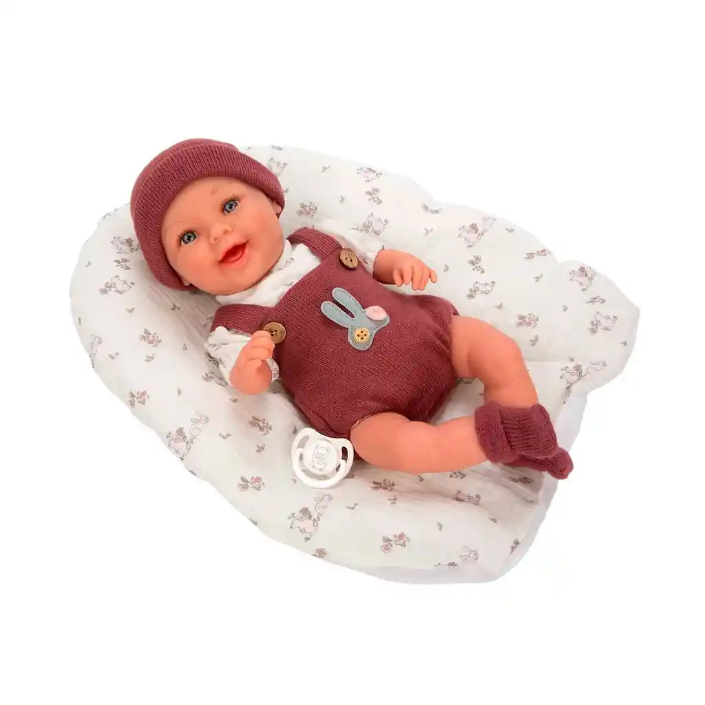 El muñeco de peso Elegance Gadi Granate de 35 cm Arias combina ternura y realismo con su peso, que lo hace sentir como un bebé de verdad. Viste una jardinera y gorrito en tonos granate y blanco, acompañado de un cojín con estampado de flores, creando un conjunto completo y acogedor. Incluye chupete, y destaca por ser suave al tacto y por sus bellos ojos azules, convirtiéndolo en una pieza ideal para coleccionistas de muñecos reborn o como regalo especial para quienes buscan un bebé delicado y realista.