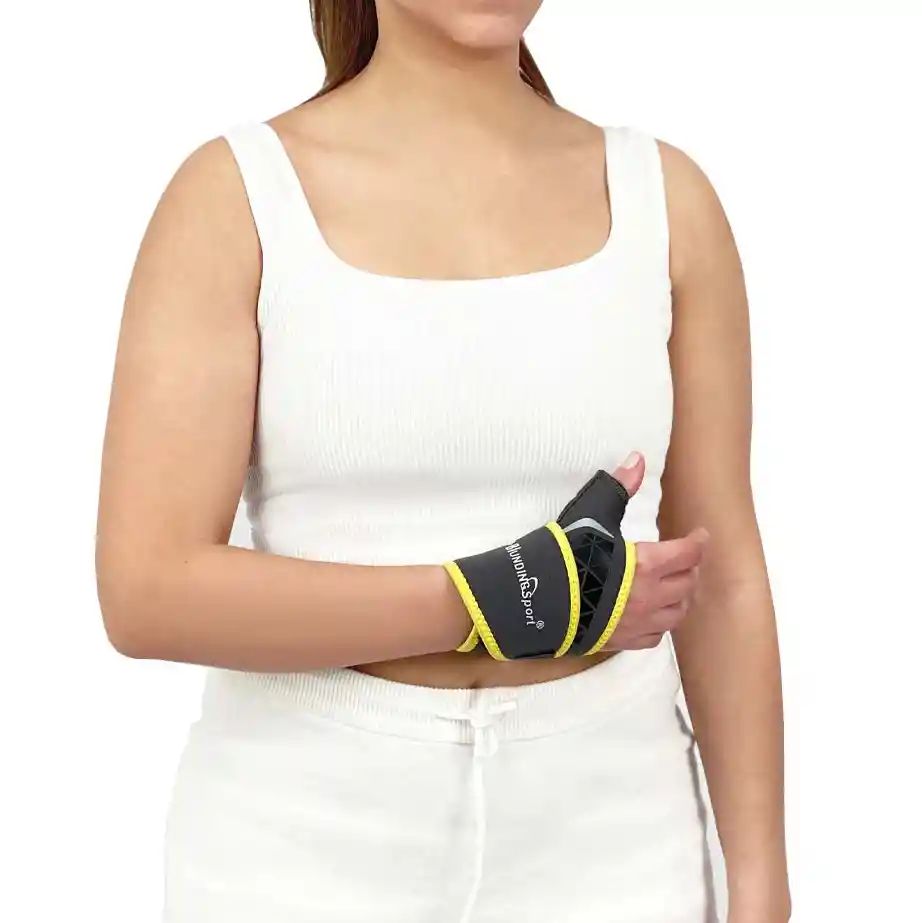 Muñequera inmovilizadora ambidiestra con férula en dedo pulgar confeccionado en neopreno respirable y ajustable con cierre de velcro.<br /><br />INDICADO PARA <br /><br />Lesiones en las articulaciones del pulgar<br />Laxitud ligamentosa del pulgar<br />Artrosis de la articulación carpo metacarpiana del pulgar<br />Artritis reumatoide.<br /><br />TALLAS Y MEDIDAS:<br /><br />Small (S):<br />Contorno de Muñeca: 16 cm. O menos<br />Contorno dedo pulgar: 6 cm. O menos<br /><br />Medium (M):<br />Contorno de Muñeca: 14 cm. - 17 cm.<br />Contorno dedo pulgar: 6 cm. - 7 cm.<br /><br />Large (L):<br />Contorno de Muñeca: 17 cm. - 19 cm.<br />Contorno dedo pulgar: 7 cm. - 8 cm.<br /><br />Color: Negro/Amarillo<br /><br />COMPOSICIÓN:<br /><br />Neopreno Respirable: 100% Poliéster<br />Cierre de Contacto: 100% Nylon<br /><br />CERTIFICACIÓN Y REGISTROS;<br /><br />Certificación de Norma ISO-9001/2008 Sección 8.2.3 NºCL13/20100668<br />Registro del Instituto Nacional de Salud Pública Nº EDM 198/14<br /><br />*Blunding recomienda utilizar este producto bajo prescripción médica.