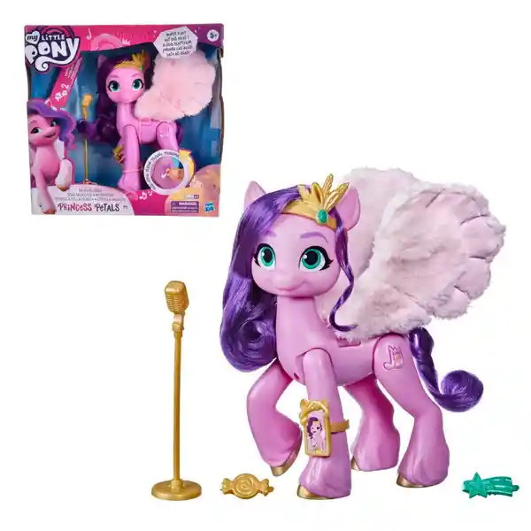 Contiene 6 Unidades. Pony 1 Und + Accesorios 5 Und. Conoce a la Princesa Petals la Cual es Una Hermosa Pegaso de Los Altos de Céfiro Ella es Una Estrella Del Pop Con Mucho Estilo y Juntas Podrás Imaginar Que Hacen un Gran Espectáculo en la Gala Real. Pasa Interminables Horas de Mucha Diversión y Entretención Con la Pony Cantante de my Little Pony Movie la Cual Tiene Unas Medidas de 15 cm Siendo Esta Una Figura Articulada y Cuenta Con Una Suave y Rizada Melena de Color Morado. Esta Figura Reproduce Música y se Mueve Solo Debes Presionar su Cutie Mark y Podrás Oírla Tararear un Fragmento de la Canción ''Glowing Up''. Aprieta Sus Patas Traseras Para Que Sus Hermosas y Suaves Alas se Muevan Hacia Arriba y Hacia Abajo. Imagina Que la Princesa Petals Vuela Mientras Canta Para Sus Fans y Prepárala Para el Espectáculo Con Sus Accesorios Incluidos.