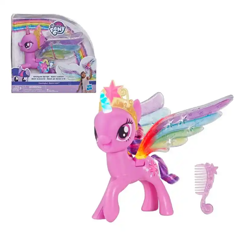 Twilight Sparkle representa el elemento de la armonía y la magia, además es una princesa. Este hermoso pony tiene alas y un cuerno como de unicornio. Imagínala volando por las nubes con sus hermosas alas de arcoíris inspiradas en las escenas de la serie y película. Presiona su distintiva cutie mark para iluminar el cuerno de unicornio y cuando mueve las alas también se iluminan. Además, incluye una diadema de princesa y un peine para estilizarle la crin y la cola púrpuras. Vuela por los cielos esparciendo la magia de la amistad.