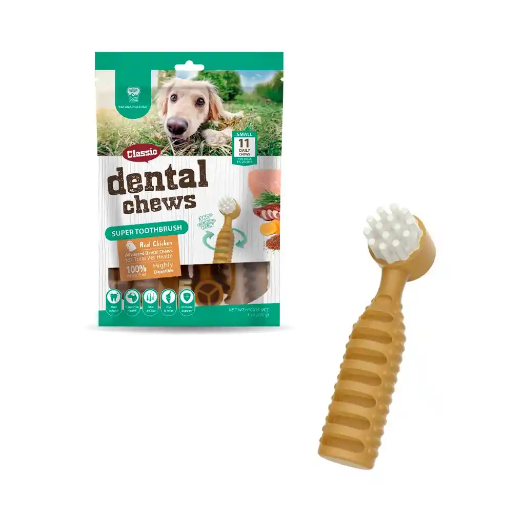 El super thoothbrush sabor pollo de Natura Nourish ofrece una solución total para la salud de las mascotas. A tu amigo canino le encantará masticar estas golosinas dentales super deliciosas, ideales para limpiar sus dientes y mantenerles el aliento fresco. Preparadas con los ingredientes más saludables para ofrecer la nutrición necesario, haciendo que tu perro pueda mantenerse saludable todos los días. Su sabor a pollo hace que sean más ricos de digerir, además, promueve la salud dental ya que con su diseño ofrece una limpieza de 360°, también ayuda a mejorar la piel y el pelaje, ayuda al sistema inmunológico y ayuda con las articulaciones y cadera. Cada bolsita de Natura Nourish incluye 11 mini thoothbrush, para uso diario intermitente o como alimentación suplementaria.