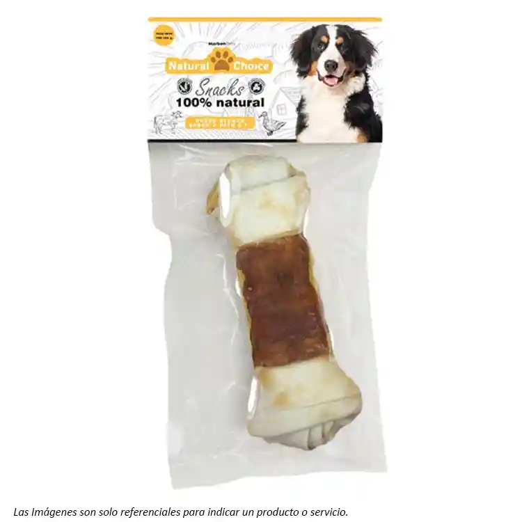 Hueso seguro elaborado de carnaza (cuero de vacuno) con carne deshidratada de Pato, sin colorantes artificiales, para Perros de todas las Edades y Razas según su mándibula. Tamaño aproximado entre 15 a 18cm.