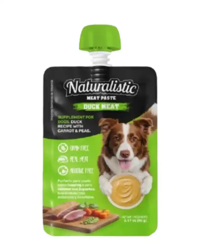 Naturalistic Meat Paste Duck 90 g es un alimento húmedo para perros con textura tipo compota, perfecto para usar como topping sobre alimento seco, snack o para rellenar juguetes interactivos. Elaborado con carne real de pato como ingrediente principal, ofrece un sabor diferente e irresistible que ayuda a estimular el apetito. Su consistencia suave lo hace ideal para perros de todas las edades, especialmente aquellos más exigentes o con dificultades para masticar. Además, su fórmula incorpora prebióticos que favorecen la salud digestiva y es libre de granos, siendo una excelente alternativa para perros con sensibilidad alimentaria. Este producto es un alimento complementario, pensado para enriquecer la dieta diaria con sabor, variedad y beneficios funcionales. 🌟 Beneficios principales 🦆 Elaborado con carne real de pato como fuente de proteína. 🥣 Textura tipo compota, fácil de consumir. 🌿 Con prebióticos que apoyan la salud digestiva. 🚫 Libre de granos, ideal para perros sensibles. 🧩 Perfecto como topping o para rellenar juguetes interactivos. 🧡 Ingredientes destacados 🦆 Carne de pechuga de pato: Fuente de proteína sabrosa y altamente palatable, ideal para estimular el apetito. 🌿 Fructooligosacáridos (FOS): Prebióticos que ayudan a mantener una flora intestinal saludable. 🥕 Zanahoria: Aporta fibra y antioxidantes que favorecen la digestión. 🌱 Arvejas: Fuente vegetal que contribuye con fibra y nutrientes complementarios.